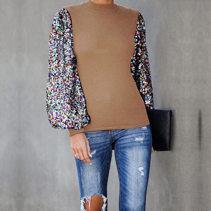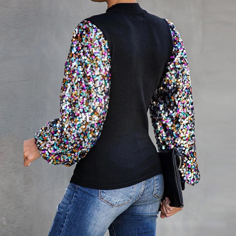 Women Sweater Pullovers Half Turtleneck Long Puff Sleeve Sequined Jumpers Patchwork Slim Sweater Vintage Women Autumn Sweater